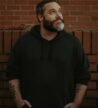 A hand holding a smartphone displaying an online shopping webpage. The screen shows a listing for a unisex sweatshirt with multiple images of a person modeling the garment. The background is a blurred scene of trees and green grass, suggesting an outdoor setting.